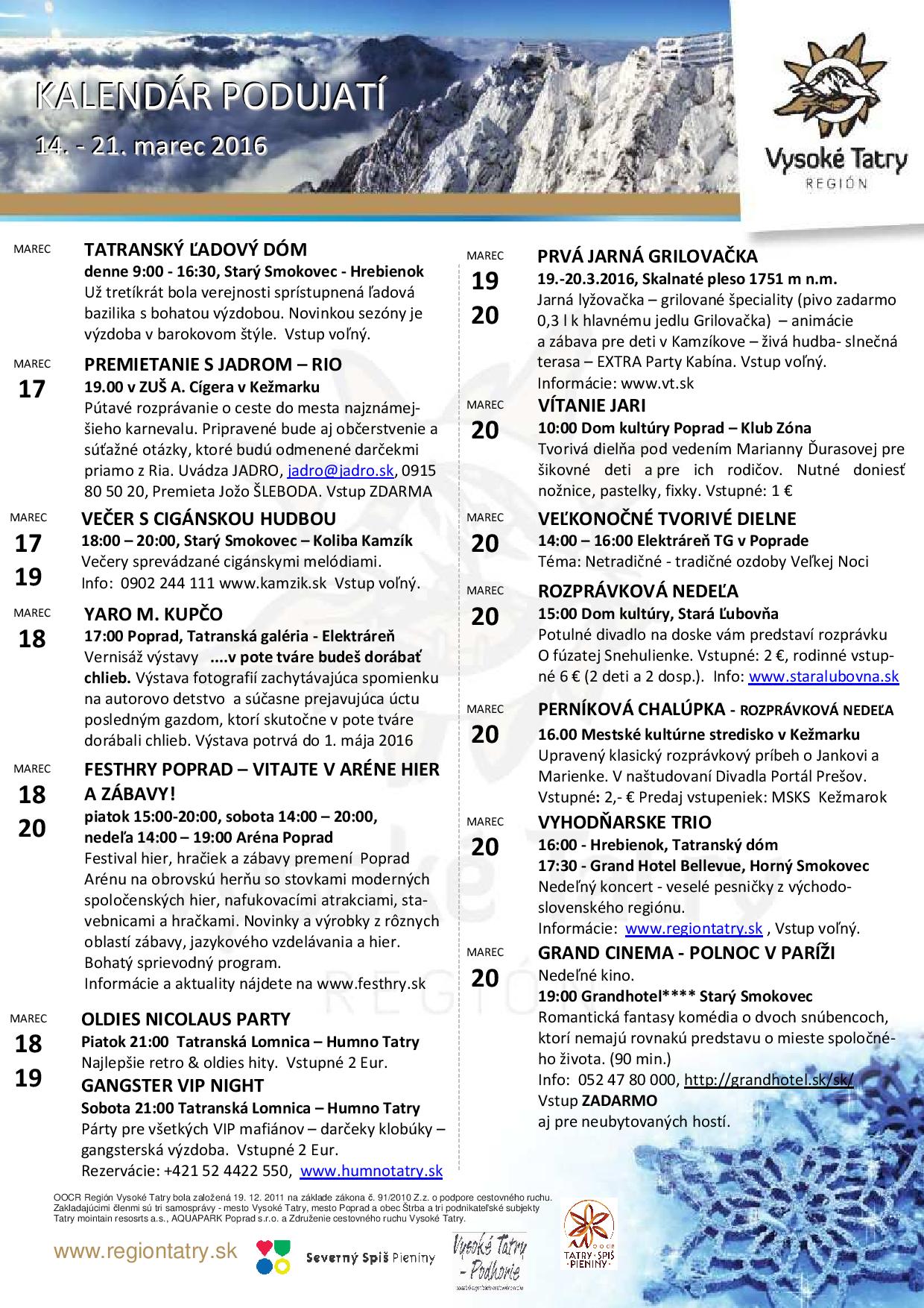 NezaradenéKalendár podujatí Regiónu Vysoké Tatry 14.-20.03.2016 Posted on 14. marca 201630. januára 2018 by slnecnydom slnecnydom Newsletter 07. – 13. 3. 2016 Veľkonočný newsletter