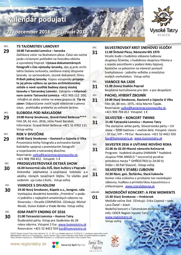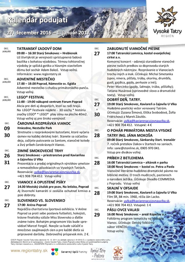 NezaradenéKalendár podujatí regiónu Vysoké Tatry 27.12.2016 – 1.1.2017 Posted on 27. decembra 201630. januára 2018 by slnecnydom slnecnydom Tatranské Vianoce pokračujú Tatranský ľadový dóm v najbližších dňoch