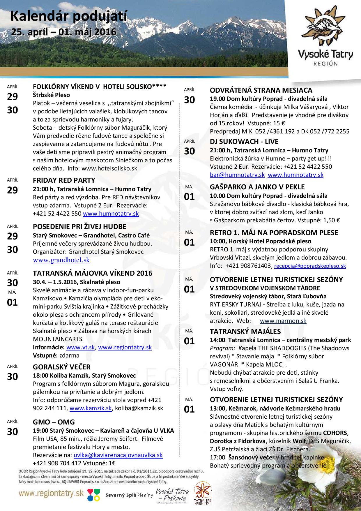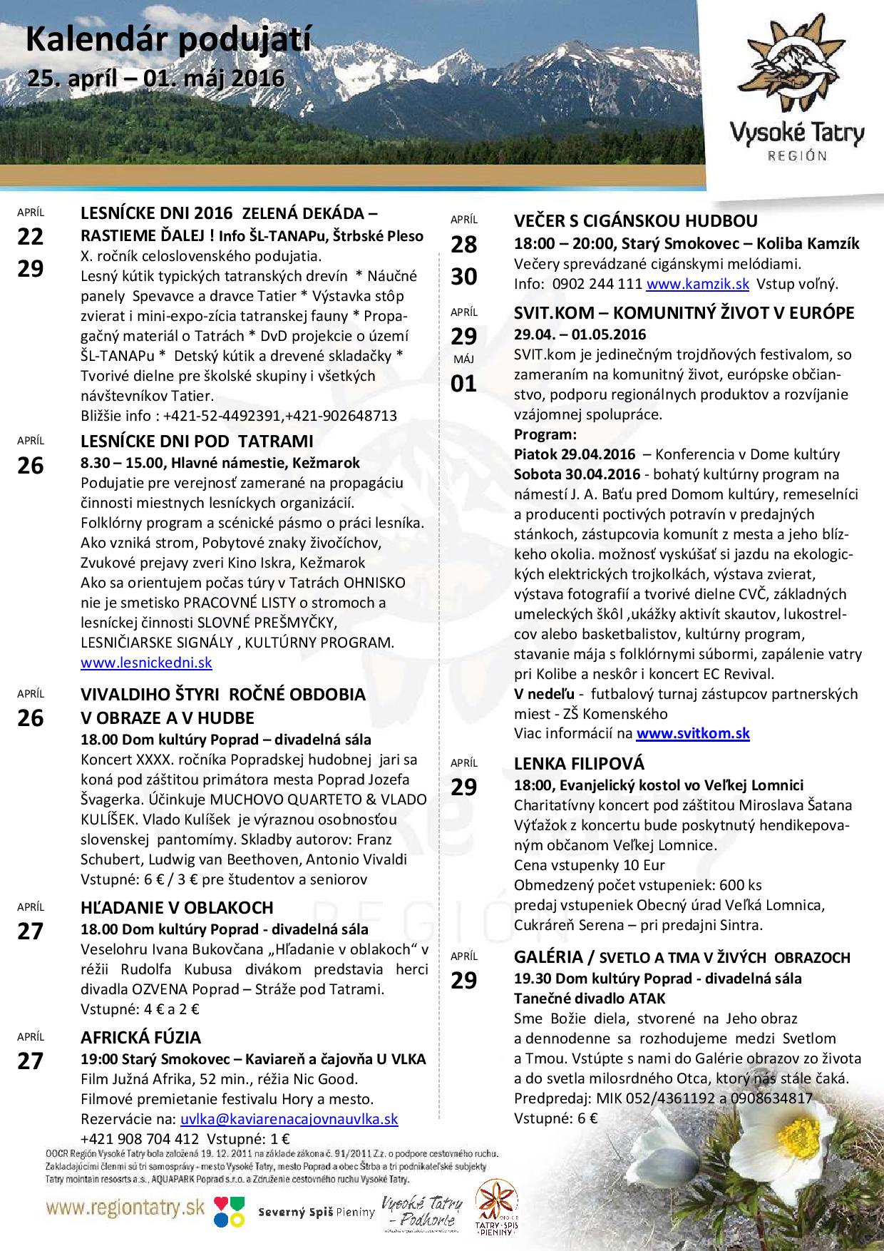 NezaradenéNewsletter 25. 4. – 1. 5. 2016 Posted on 26. apríla 201630. januára 2018 by slnecnydom slnecnydom Podujatia v Tatrách a okolí 18.4. – 26. 4. 2016 Botanická záhrada v Tatranskej Lomnici otvára svoje brány