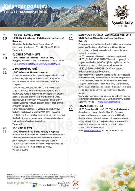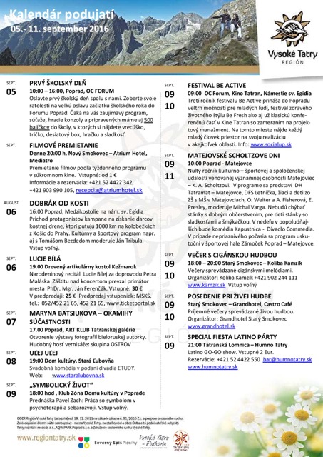 NezaradenéNewsletter – kalendár podujatí Regiónu Vysoké Tatry 05.-11.09.2016 Posted on 5. septembra 201630. januára 2018 by slnecnydom slnecnydom Tatranská galéria v poprade: MARYNA BATSIUKOVA – Okamihy súčastnosti Jesenné kino Hotela Lomnica
