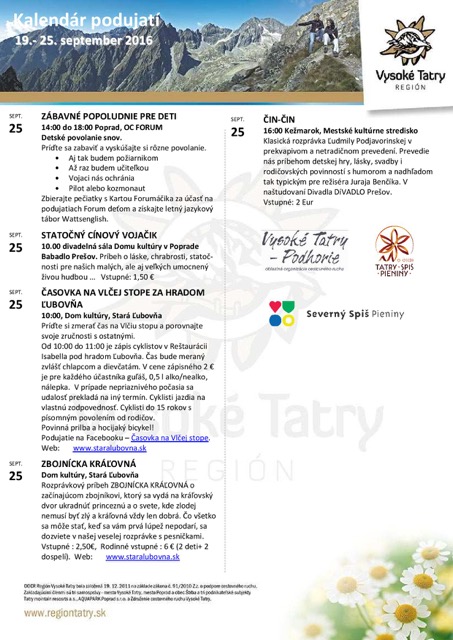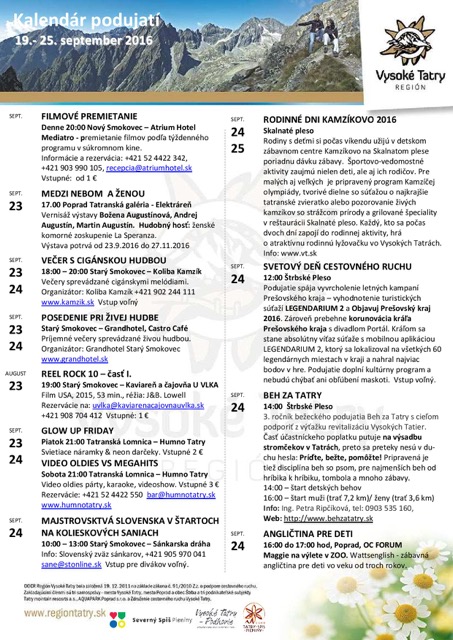 NezaradenéNewsletter – kalendár podujatí Regiónu Vysoké Tatry 19.- 25.09.2016 Posted on 20. septembra 201630. januára 2018 by slnecnydom slnecnydom Jesenné kino Hotela Lomnica Newsletter – kalendár podujatí Regiónu Vysoké Tatry 26.09.- 02.10.2016