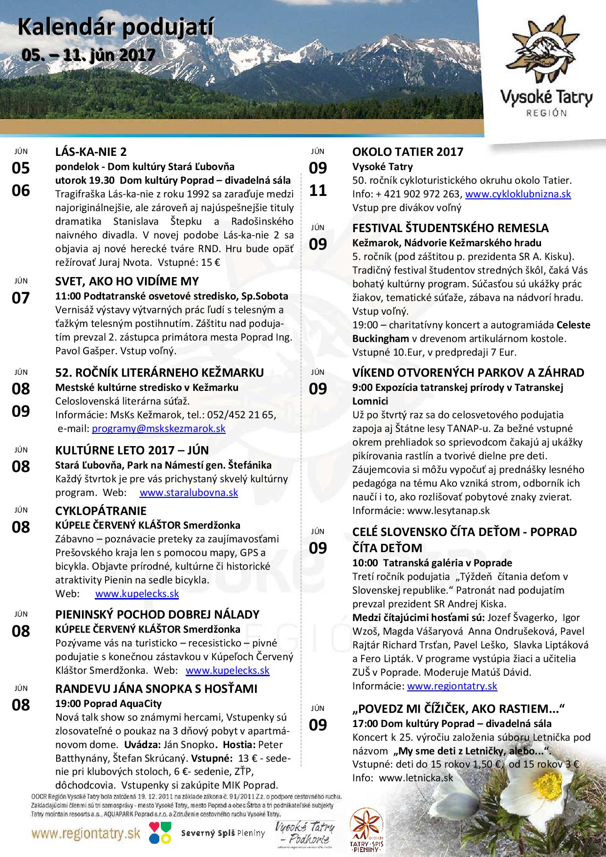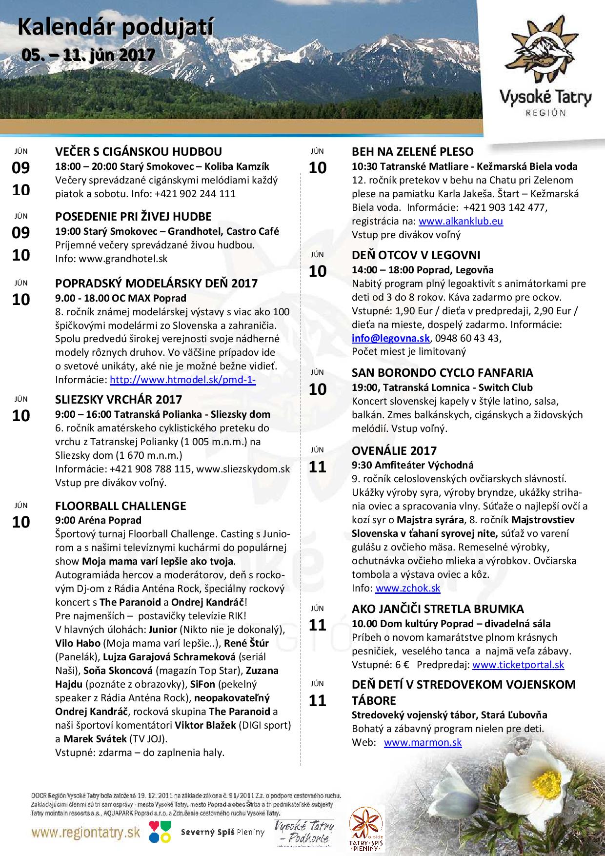 Newsletter – kalendár podujatí Regiónu Vysoké Tatry 5.- 11.6.2017