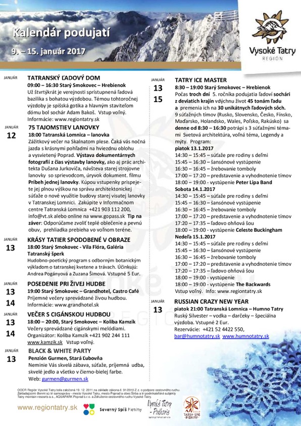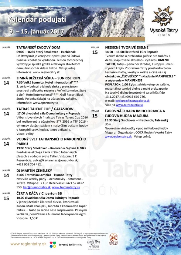 Newsletter – kalendár podujatí Regiónu Vysoké Tatry 9.-15.1.2017