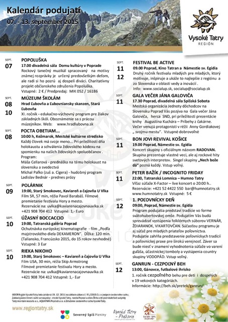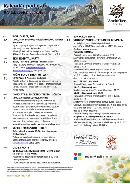 NezaradenéNewsletter – prvá polovica septembra v Tatrách a okolí Posted on 8. septembra 201530. januára 2018 by slnecnydom slnecnydom Záver prázdnin v Tatrách a okolí FEST OKTÓBER 2015