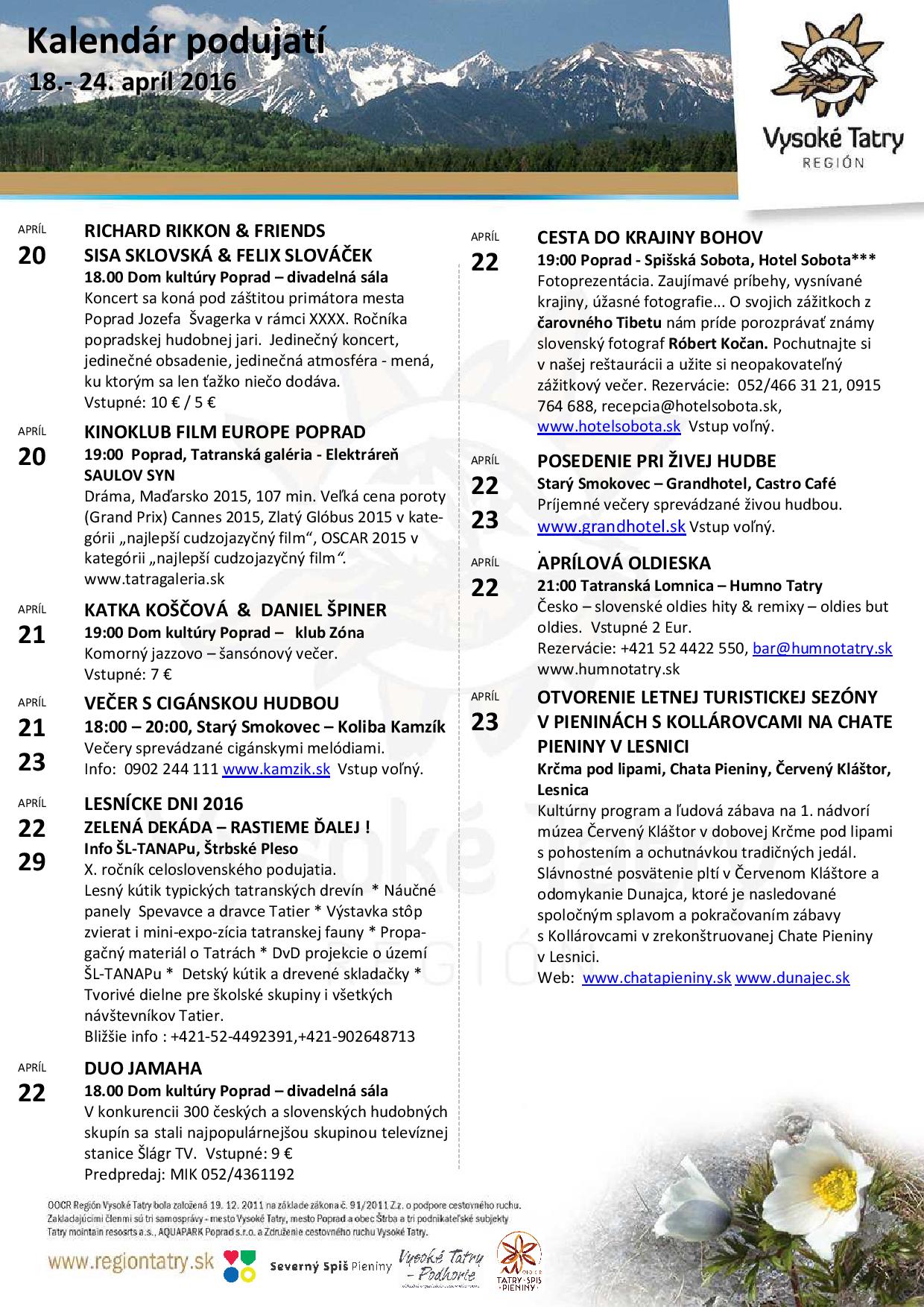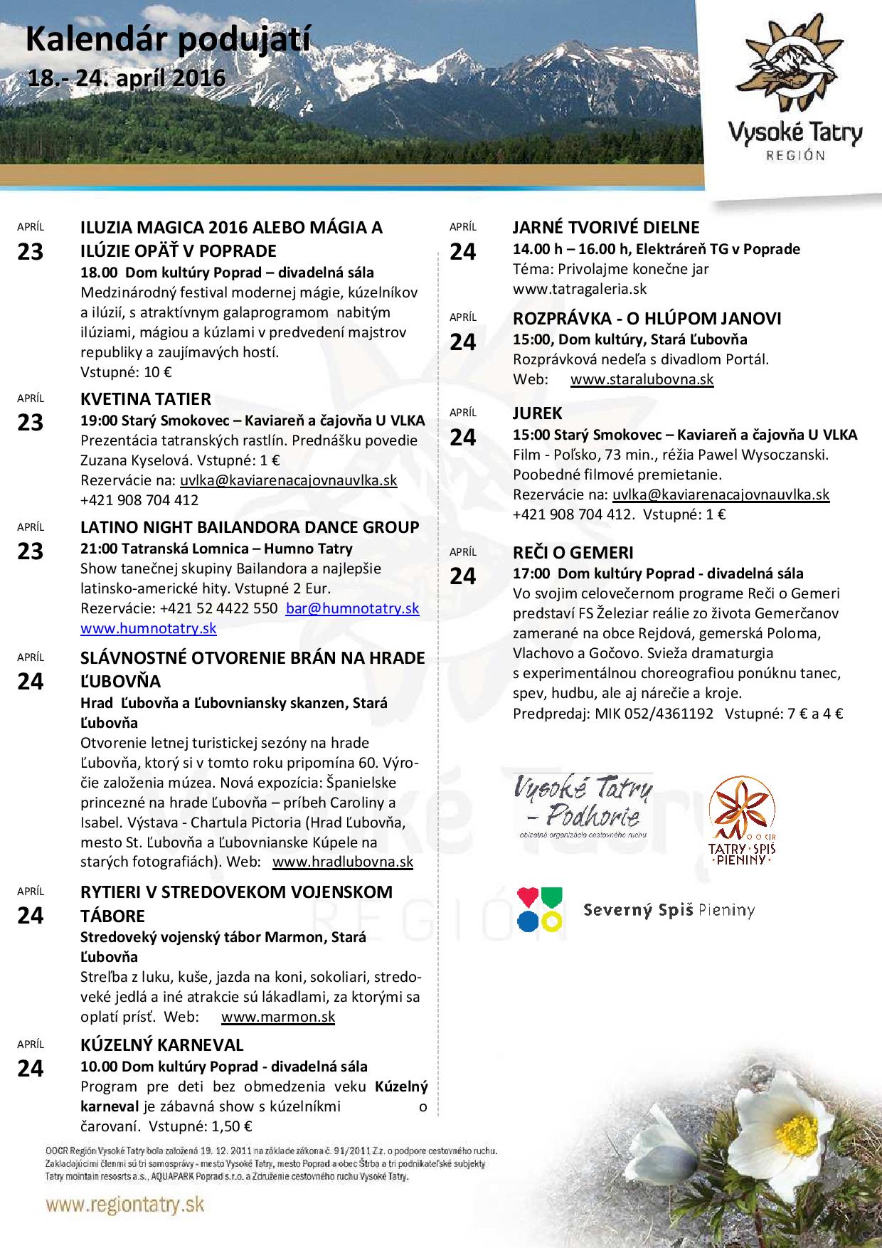 Podujatia v Tatrách a okolí 18.4. – 26. 4. 2016